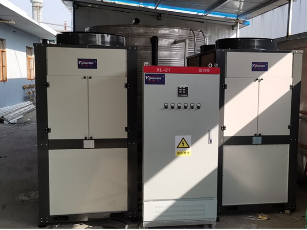 设备配置:2台20匹空气源热泵机组,一只10立方保温储热水箱,5套换热盘管。
