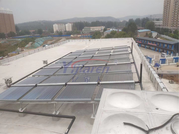 配置YJR-58*1800*50G太阳能集热模块,空气能热泵配置3台,水箱两个。有太阳的时候,系统优先使用太阳能加热,阴雨天在热水箱温度低于40度(可根据需要设定温度)的情况下,会自动切换到热泵启动加热辅助模式,用空气能热泵比电加热省60%左右加热费用,有太阳能更可以更省。太阳充足的时候,几乎不用电,就可以满足食堂及生活的热水。