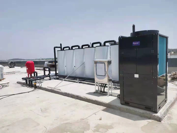 据了解,空气源模块承压热水机主要由三部分构成:主机及系统附件(一体化)、加热水箱、储能水箱。系统通过压缩机做功,空气中热能转移至水中,冷媒持续循环,热泵不断吸收热能,通过冷凝器进行有效换热,将热能传递至封闭水箱中;通过内部水流循环,将每一个模块承压水箱充满热水。亿家人工程人员为此系统配置6只455L承压小水箱+1只18KW的电加热水箱+1台10匹空气源热泵以满足使用需求。