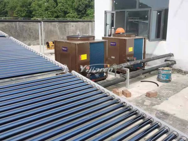 本系统为光大环保能源(新化)有限公司员工宿舍用水,采用太阳能加空气能热泵辅助系统。系统配置8吨保温水箱,12组太阳能集热器、2台5匹空气源热泵联合使用、确保24小时热水供应。