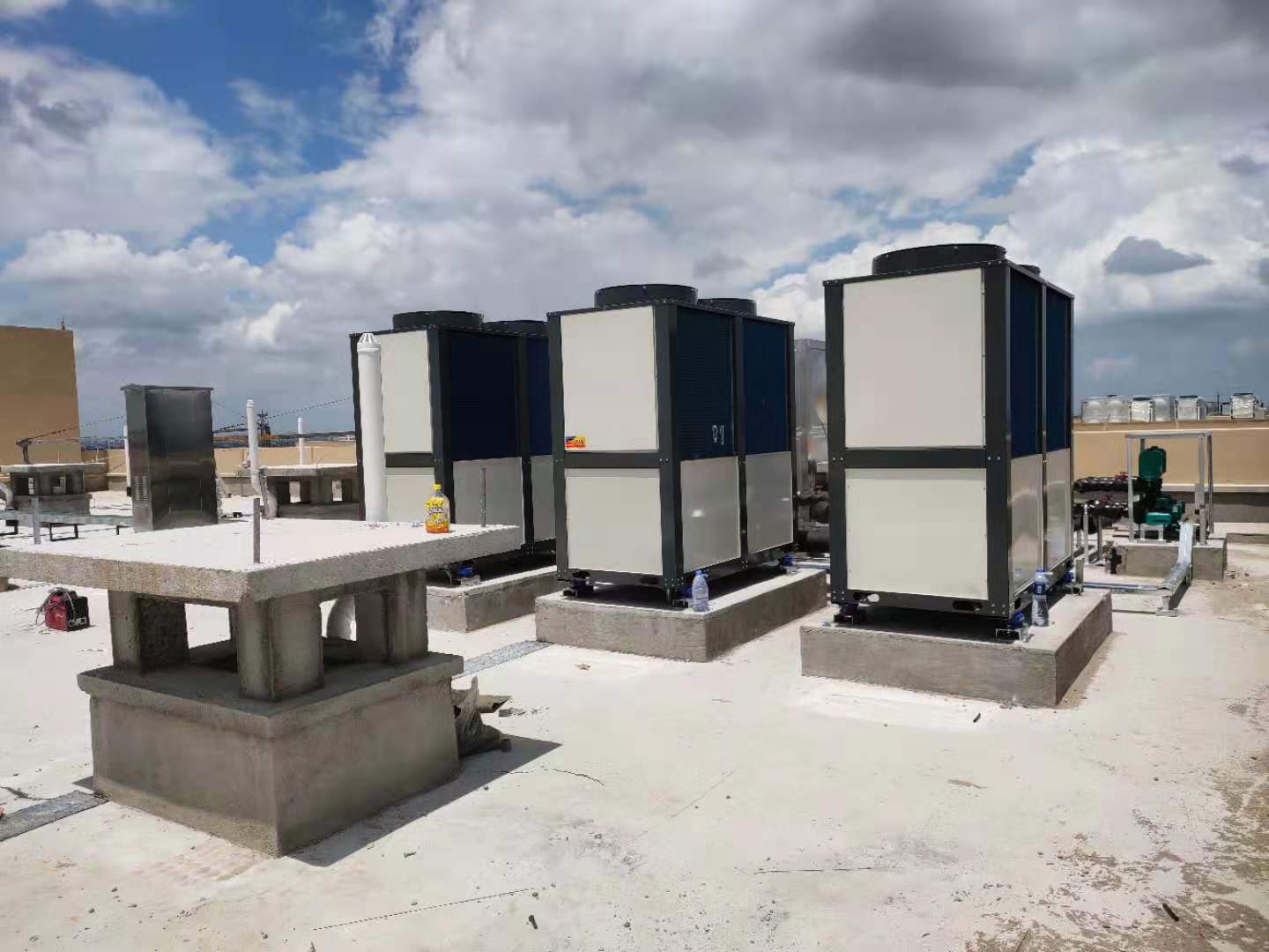 下图为苏州某花园酒店,空气能热泵空调系统安装现场,控制系统可以集中控制,可以分房间控制,可以远程控制,根据客户的需要可以定制控制系统。温度可以根据需要设定,不用担心冬季天气太冷启动不起来,冬季可以在环境温度-30℃正常使用。夏季高温40-50℃环境下空气能热泵空调正常使用。