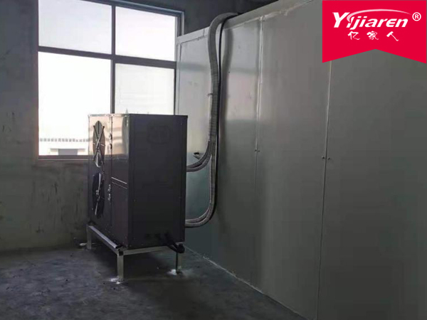 项目位于广东省珠海市,是水处理设备公司,主要生产纤维类超滤膜,要求烘房温度40-60度,要求烘房湿度≦20%,每次烘干两个物料架,每个物料架的尺寸2100mm*1200mm*2700mm,每个物料架产品的重量是200公斤,脱水率按50%设计。配置一台7匹的热泵烘干机组,因为是在南方,空气能潮湿,所以要保证烘房湿度≦20%,在烘房内配置了一台7匹的除湿一体机。这样才能确保烘房的温度和湿度。