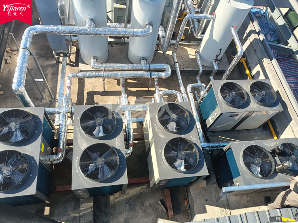 亿家人此次承接的项目为浙江绍兴伟业越商总部7号地块商业商务用房酒店供水,酒店5-10层和11-17层分区供水,3楼餐饮部厨房用水以及6楼12吨的泡池恒温,系统共配置23只500L承压水箱,1只24吨冷水箱,5台CAHP-PI-42直热式空气能,5台50KW容积式燃气热水炉辅助,餐饮部则配置2台99KW的燃气热水炉,6楼泡池恒温通过板式换热器与锅炉换热恒温。因为该酒店对热水系统的使用有着很高的要求,热水温度如果不能达到客户的需求,或者等待时间较长,都会影响客户的入住体验。亿家人空气能热水机组采用PLC控制柜并搭配使用智能热水系统模块,可实现电脑和手机多端控制,实时显示设备的工作状态、温度等参数,可及时调整各种运行参数和设定值,并在出现异常时及时发出告警信息,工作人员可以在故障发生之前及时进行维护,及时排除故障,保障热水正常供应。亿家人高效节能的空气能热泵机组已在宾馆、工厂、度假酒店、学校等地得到广泛应用,为用户提供安全舒适的热水服务,深受商户和顾客的好评!