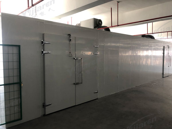 历时5到6个小时,在物料装入烘干房后两小时内,温度快速升到60到65度,不用排湿。这一过程主要是起到一个发酵的过程,控制肉不变色变味。这就是我们说的预热阶段。预热时间后,调节温度到45到50度,湿度控制在50%到55%的范围之内。