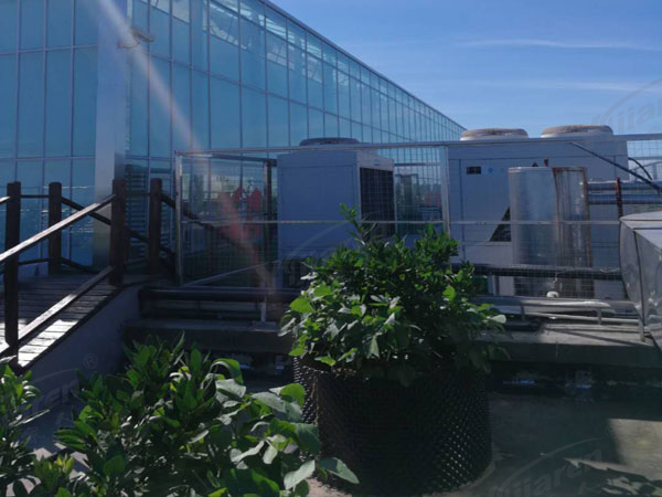 项目位于山西晋城市,建筑面积6600㎡,是一片连栋花卉大棚,四周都是玻璃,顶层为1cm厚的阳光板。夏季配有水帘降温,但冬天没有保温设施,白天有阳光直晒时大棚可以吸热,晚上没有任何保温措施。客户选择用空气能热泵来保温。
