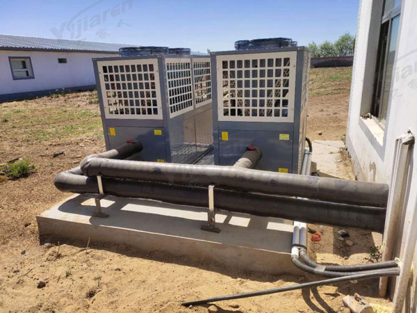 设备选型:采用二台20匹超低温空气源热泵机组+一个5吨保温蓄能水箱